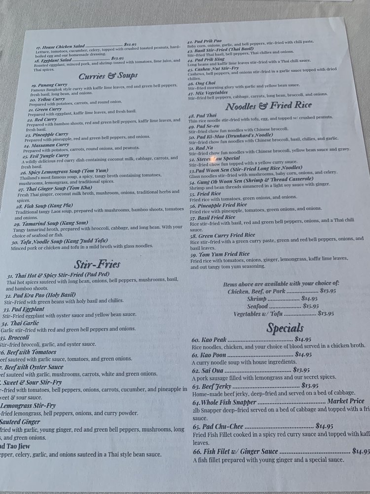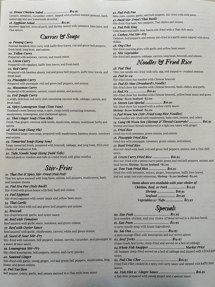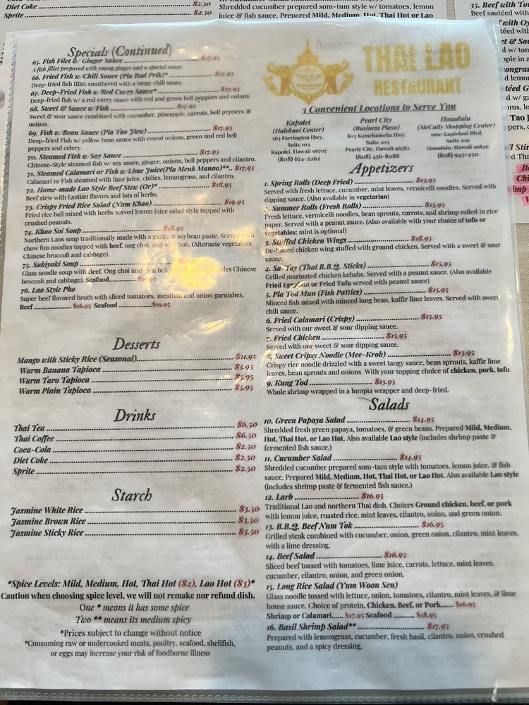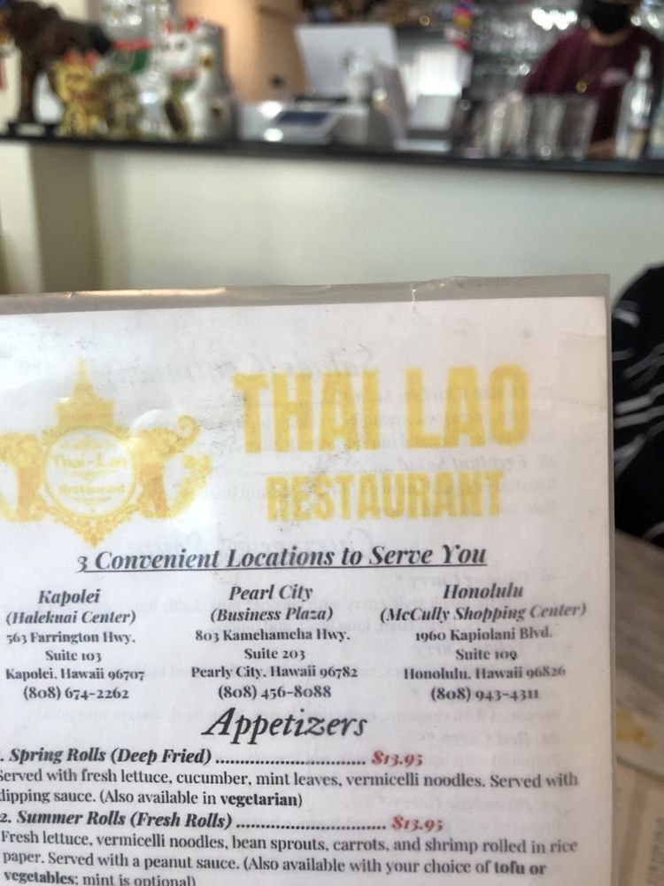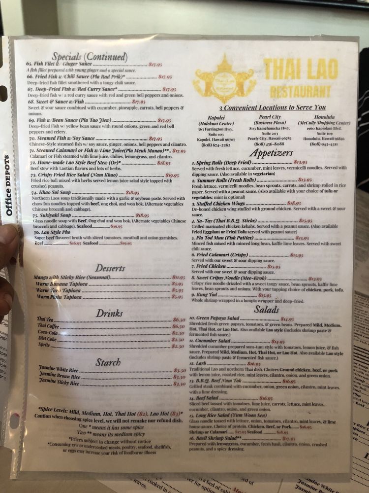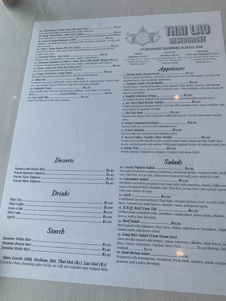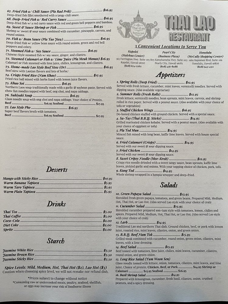 At Thai Lao Restaurant, located in Kapolei, Hawaii, you can indulge in a variety of Laotian and Thai cuisine options. From appetizers like Deep-Fried Spring Rolls to flavorful curries such as Panang, Yellow, and Green Curry, the menu offers a diverse selection. Customer reviews rave about the Spicy Lemongrass soup (Tom Yum) and the Stuffed Chicken Wings, highlighting the delicious and authentic flavors of the dishes. With options for vegan and vegetarian diets, along with delivery and takeout services, this restaurant caters to a wide range of preferences. The extensive menu, warm atmosphere, and friendly service make Thai Lao Restaurant a must-visit dining destination for those craving flavorful Asian cuisine.