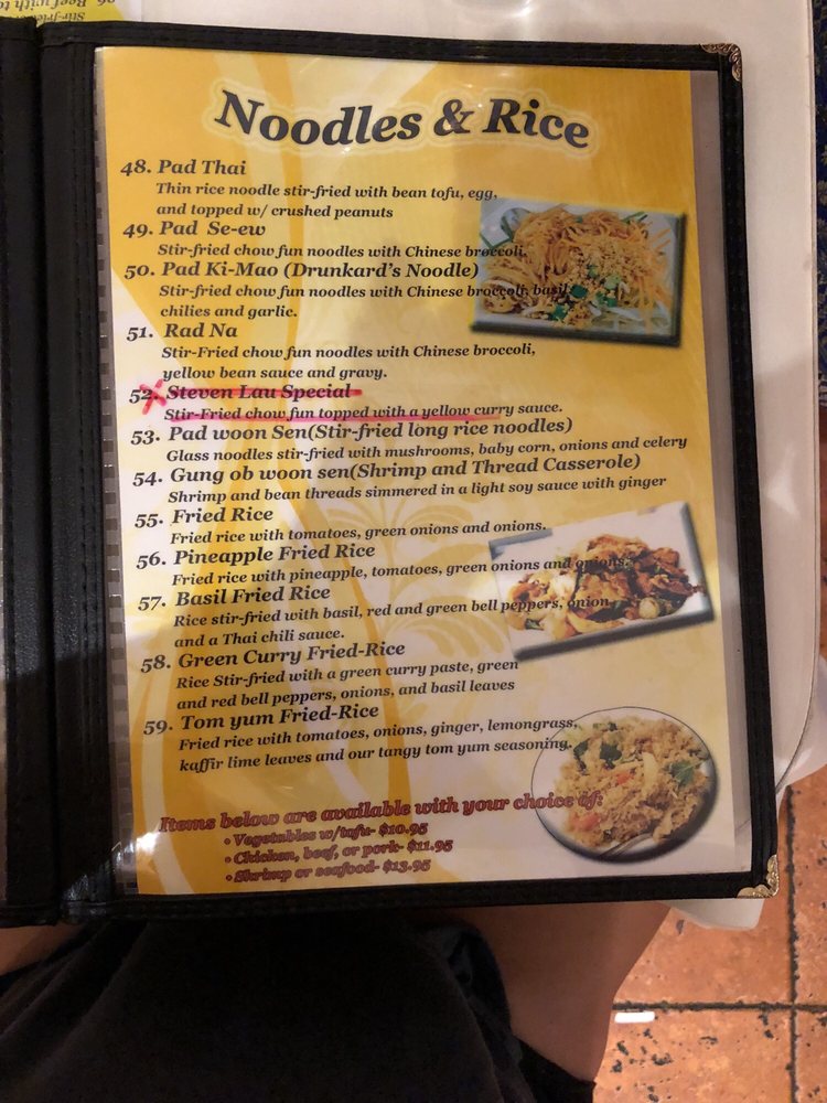 Thin rice noodle, stir-fried with bean, tofu, egg, and topped with crushed peanut.